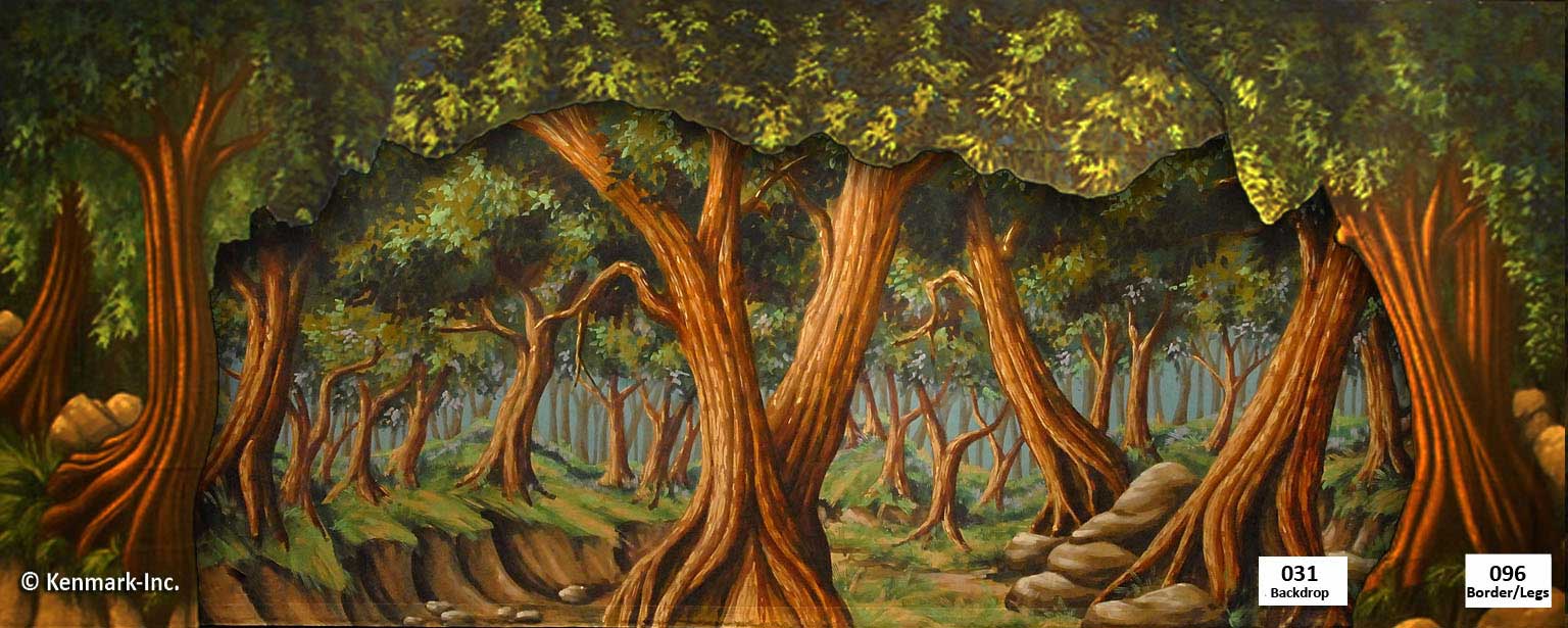 D031 Forest is a beautiful forest scene has many different applications and can be used in numerous shows. It would be perfect when the Director is seeking a “darker” or more “realistic” look for a forest scene in shows such as Into the Woods, Cinderella and Shrek the Musical. For an even richer look with more depth, pair D031 Forest with D970 Forest Border and Legs, D971 Forest Border and Legs, D096 Forest Border and Legs or D478 Forest Border and Legs. Other variations of this drop are D125 Forest, D373 Enchanted Forest.