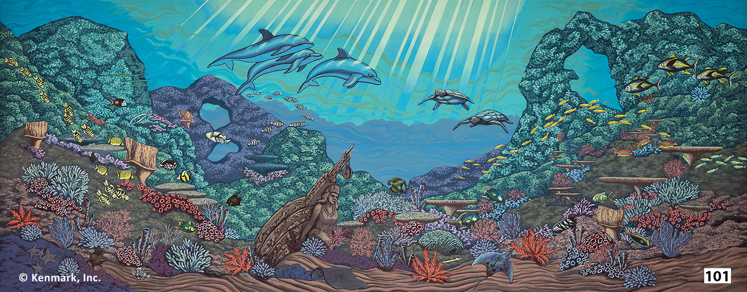 Description: Under the Sea is an underwater backdrop that is colorful and fun. It’s an excellent backdrop for dance recitals and revues. This mural has also been used for THE LITTLE MERMAID. Other sizes and variations of this drop are D363 Underwater  17' x 41'  and D027 Underwater  17' x 46'. You might also want to check out our new  complete show packages for THE LITTLE MERMAID!