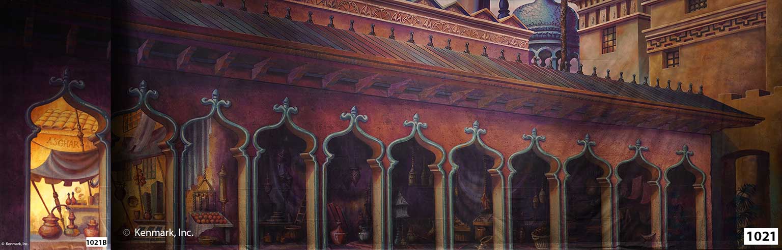 Description: Marketplace is a stunning backdrop that will transport you to the Middle East where you can practically smell the exotic aromas and feel the jostle of the customers trying to vie for the attention of the shop keepers. This beautiful drop can also be used with an additional translucent leg which can be backlit for a gorgeous effect and to provide an entrance and exit to the Marketplace street. This drop would be perfect for Aladdin or any show with a Middle Eastern scene. Both pieces are hand-painted on muslin with grommets across the top with tie lines for hanging. There is also a pocket on the bottom back of each piece so you can weight the drops with a pipe or chain if you choose.