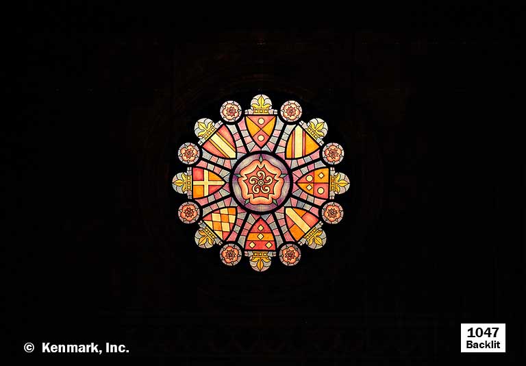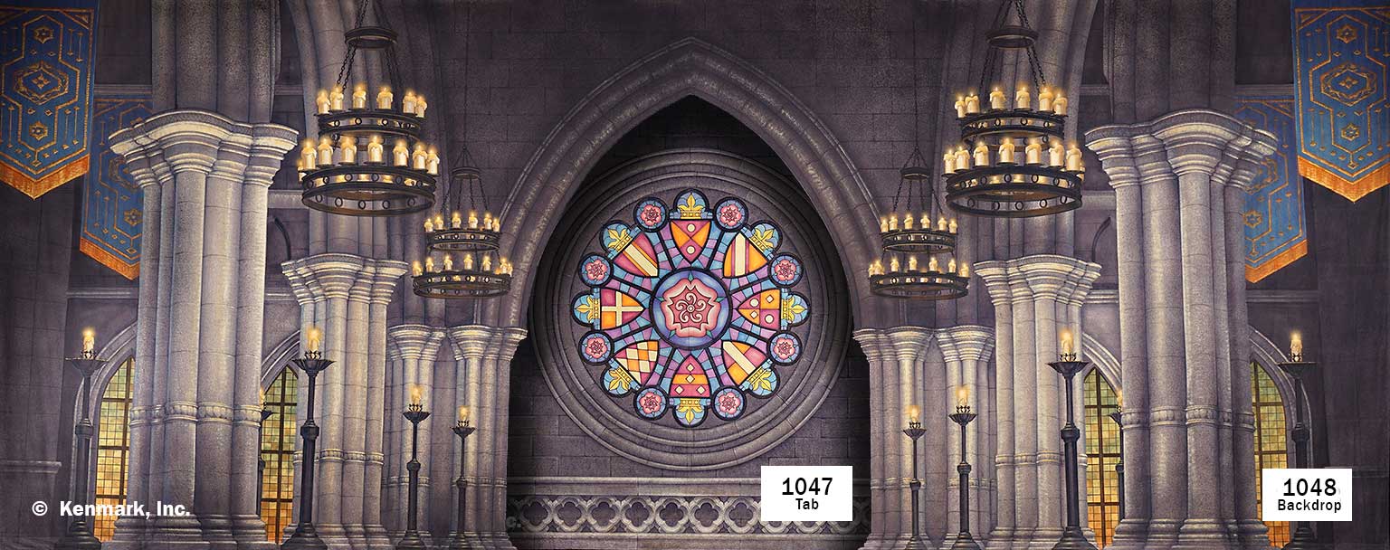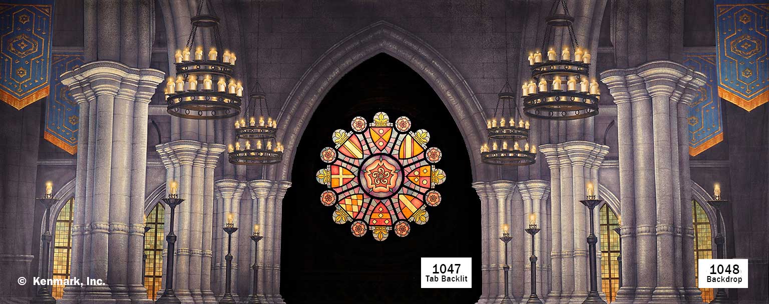 Cathedral Tab is beautifully designed with a stunning stained glass window that is translucent when lit from behind. This lovely half-size drop can be used for Shrek, the Musical, Sound of Music or Sister Act. It is hand-painted on muslin with grommets and tie lines across the top for hanging. It also has a pocket on the bottom in the back so you can weight the drop with a pipe or chain if you choose. This drop pairs beautifully with D1048 Castle Interior. Price if rented with D1048: $325