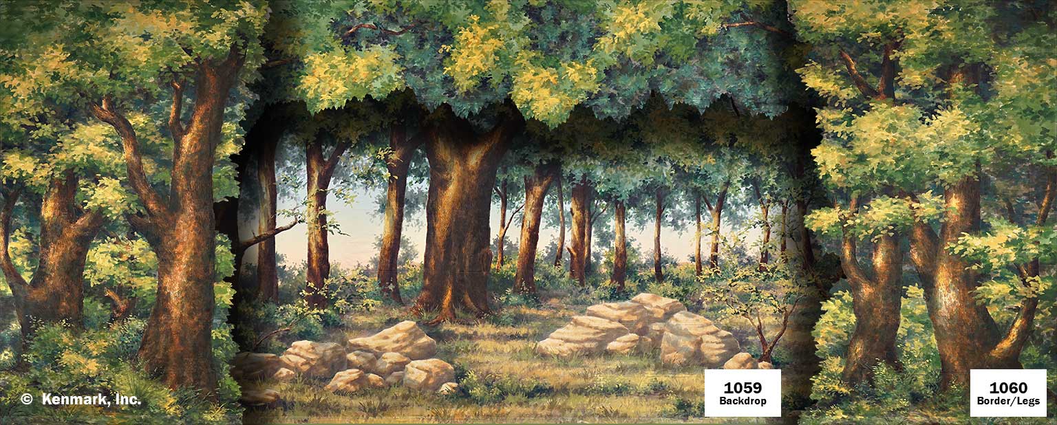 D1060 Forest Border-Legs is one of our newest Forest Border/Leg sets. It was designed to match D1059 Golden Forest, but could easily be paired with other forest backdrops. Perfect for any show using a forest scene such as As You Like It, Shrek, or Cinderella. It works beautifully on it’s own or paired with a full-sized drop. D1060 Forest Border-Legs is hand-painted on muslin. It is a three-piece set with grommets across the top of each piece with tie lines. Each piece also has a pocket on the bottom back, so you can weight the drop with a pole or chain if you choose. Must be rented with a full-size FOREST backdrop to receive the combo price.