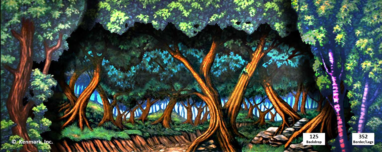 D125 Forest is a beautiful forest backdrop featuring thick green foliage and textured brown tree trunks. The land features green grass, a crevice and stones. It works well for any show requiring a dense forest, such as Beauty and the Beast, Shrek, Into the Woods or Wizard of Oz to name a few. For a truly spectacular look pair it with one of our Forest Border/Leg sets, such as D352 Forest Border/Leg set 20' x 50'. D125 Forest measures 20 feet tall by 50 feet wide. It is hand-painted on muslin and has grommets across the top with tie lines for hanging. There is a pocket on the bottom back, so you can use a pole or chain to weight the drop if you choose.