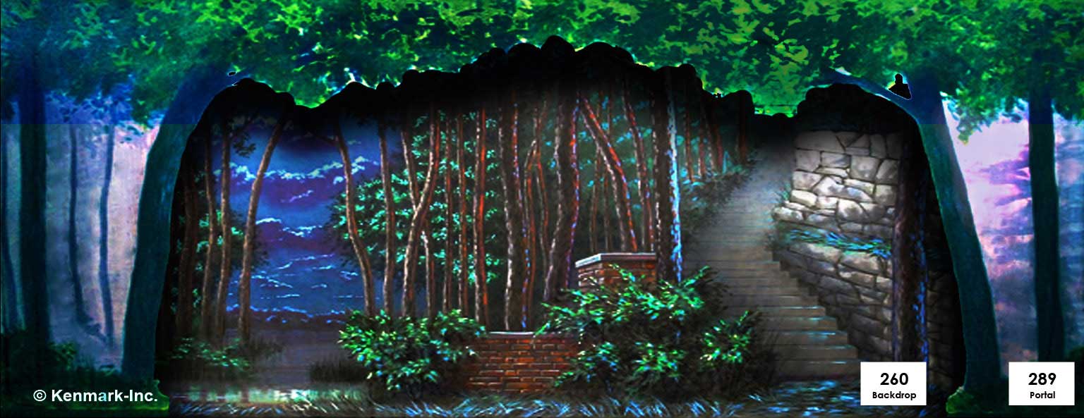 Description: Provide a dark and mysterious look to your set with this magical Park at Night backdrop.  Hand-painted on muslin the drop has grommets with tie lines across the top and a pocket on the bottom in the back so you can weight the drop with a chain or pipe if you choose.