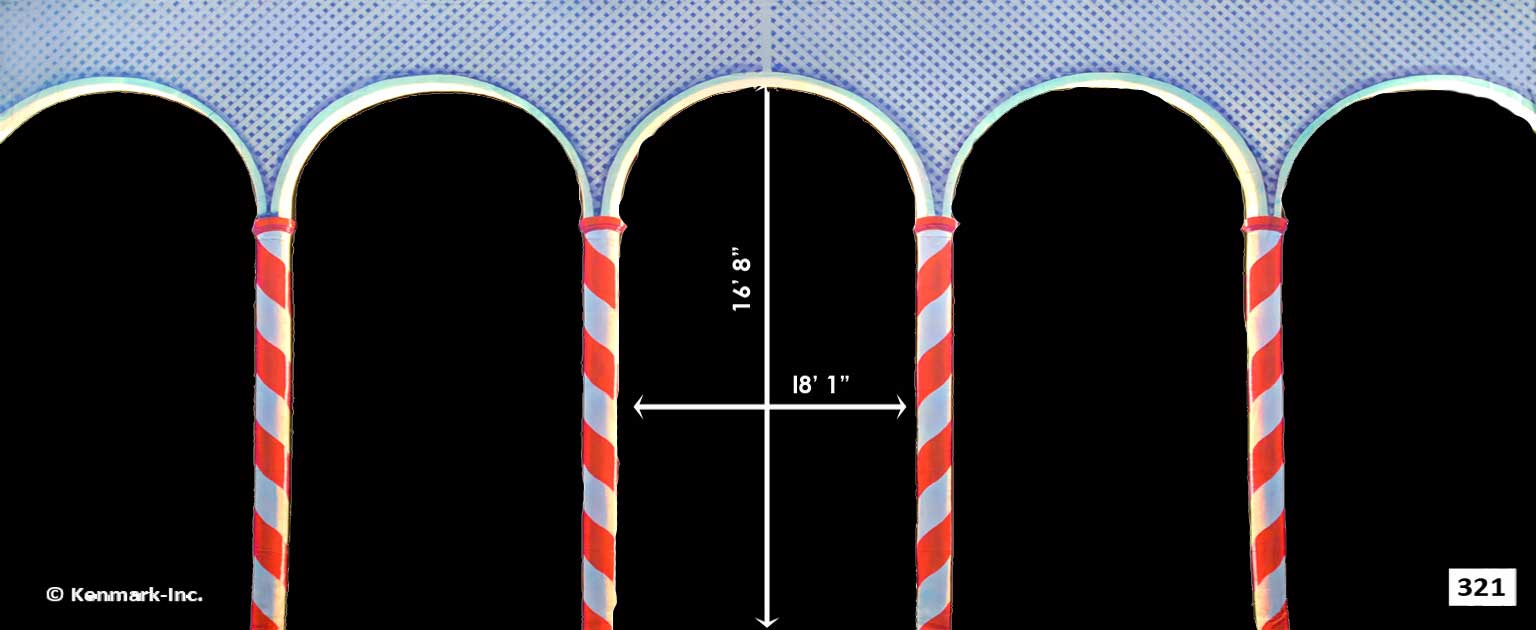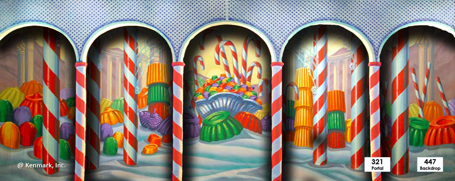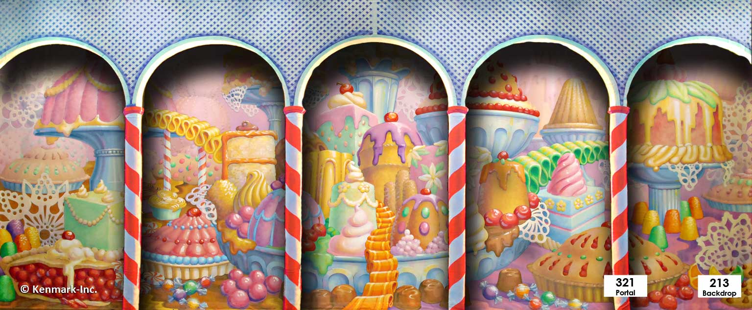 As sweet as candy this Kingdom of Sweets Portal theatrical backdrops works well as a stand alone piece or for more dramatic impact, pair this portal with one of our 20' Kingdom of the Sweets theatrical backdrops such as D420 Kingdom of Sweets or D447 Kingdom of Sweets.