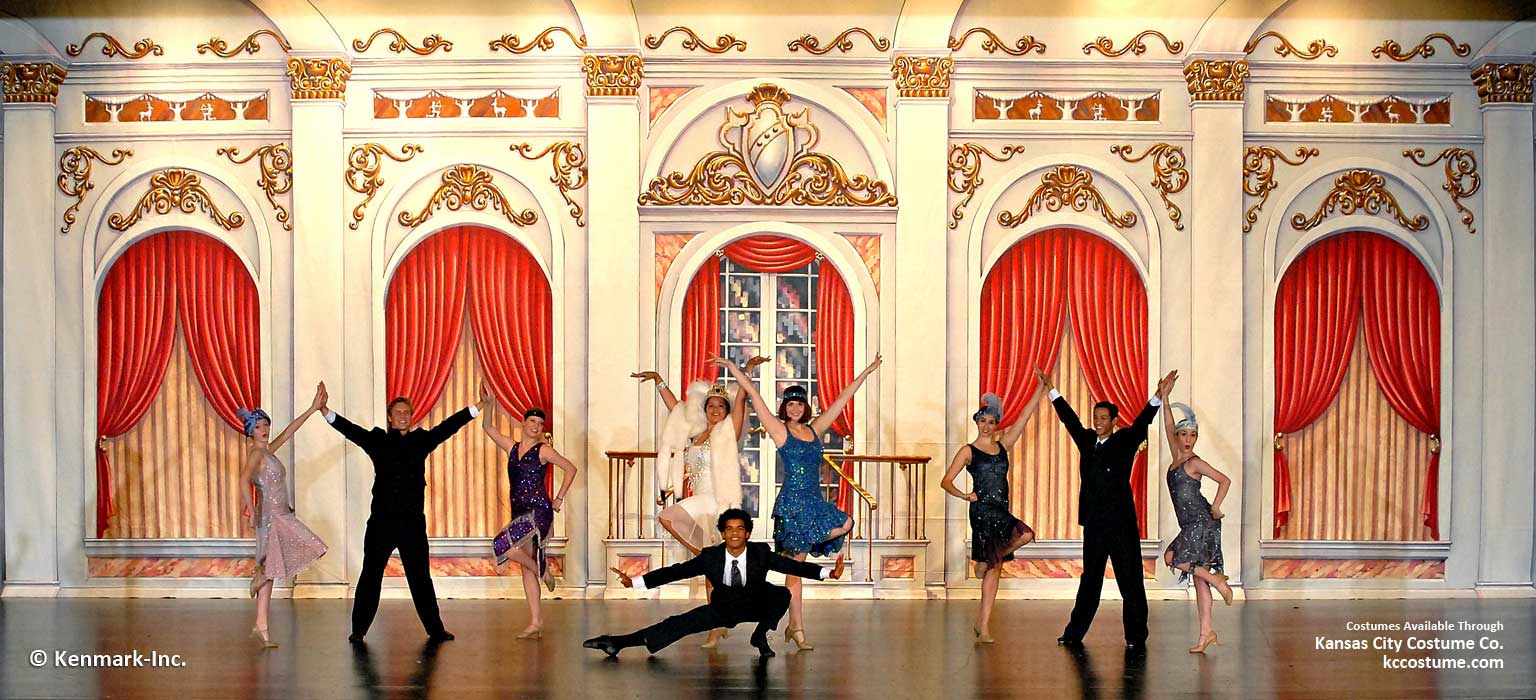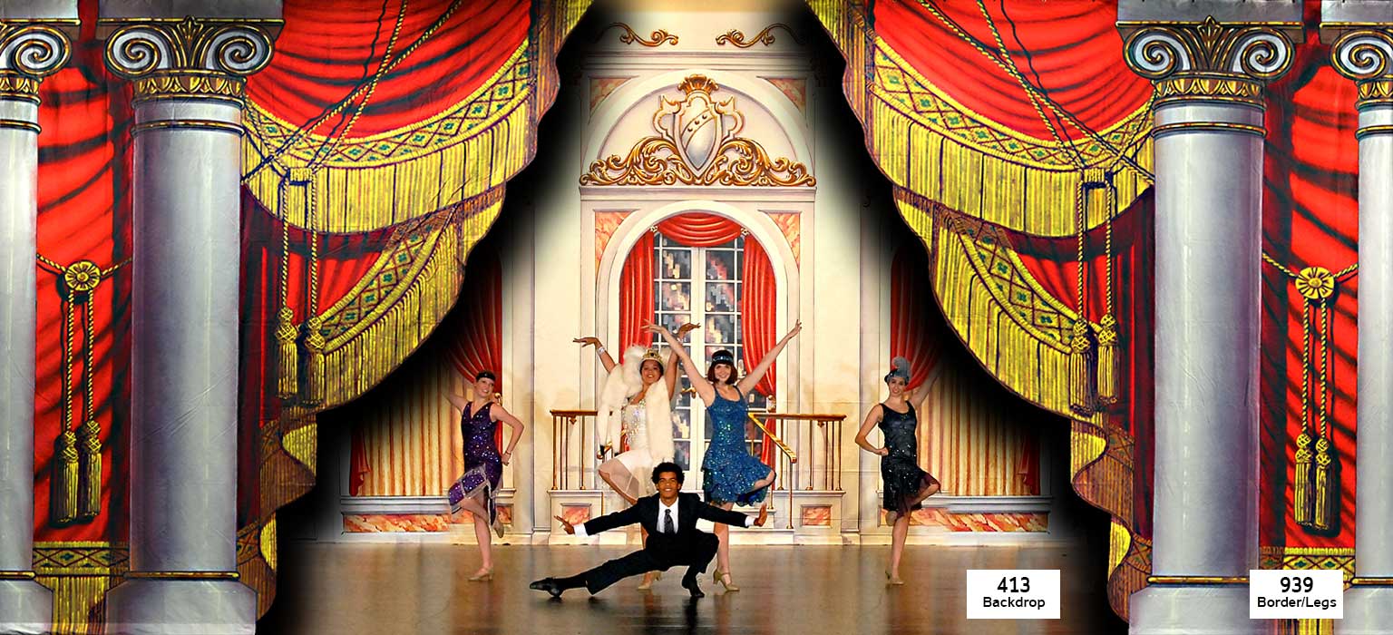 Stately Ballroom is an elegant cream colored ballroom with arched windows bearing crimson red and gold drapes. There is a small staircase leading to the double glass doors and a gold crest above the doors. It is frequently used for Nutcracker and can also be used for Annie Get Your Gun, Curtains, Thoroughly Modern Millie, Anything Goes and others. This stunning Stately Ballroom backdrop measures 20 feet wide by 50 feet high. It has grommets across the top with tie lines for hanging. It also has a pocket across the bottom in the back so you can use a pole if you choose to weight the drop. Stately Ballroom looks beautiful by itself or to create a spectacular look pair it with D939 Elegant Ballroom – Legs.