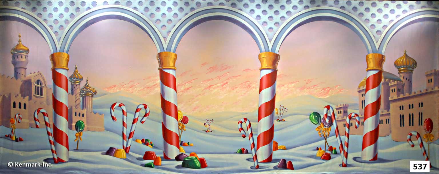 Kingdom of the Sweets is a fun, theatrical backdrop that features candy cane pillars and fluffy snow embellished with candy canes, suckers and brightly colored gum drops. There are stone buildings in the background with beautiful spires topped with gold. Kingdom of Sweets is sure to be a sweet addition to your Nutcracker set. Kingdom of the Sweets is a full sized drop that is 20 feet tall and 50 feet wide. It has grommets with tie lines across the top and a pocket on the bottom in the back for a pole to weight the drop. Kingdom of the Sweets is a very popular drop, so be sure to order early!