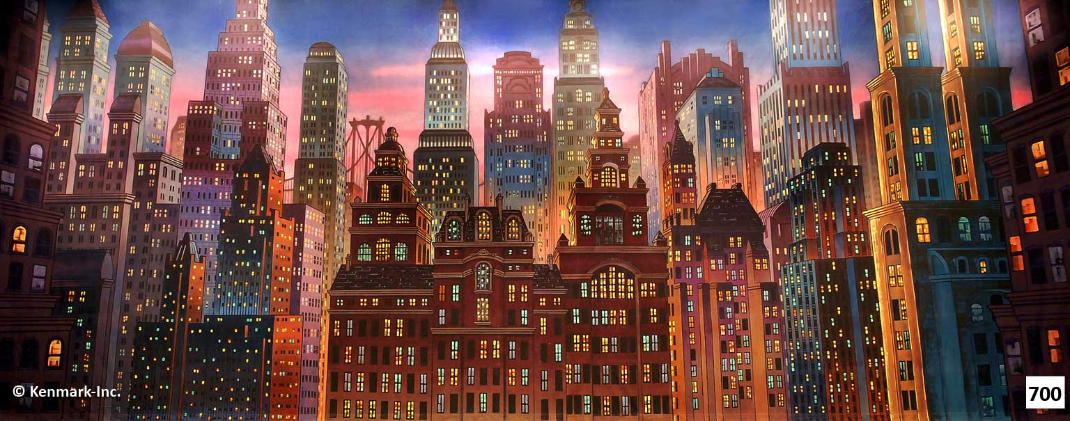 Description: New York City is a stunning theatrical backdrop that shows New York City at night. With the twinkling lights in the windows and the beautiful blues, reds and purples in the night sky you will feel like Times Square is right around the corner! It is frequently used for Annie and Thoroughly Modern Millie, but it can be used anytime you want a spectacular view of the New York City Skyline. The backdrop is 20 feet high by 50 feet wide and has grommets across the top with tie lines. There is a pocket on the back at the bottom so you can weight the drop with a pole if you choose.
