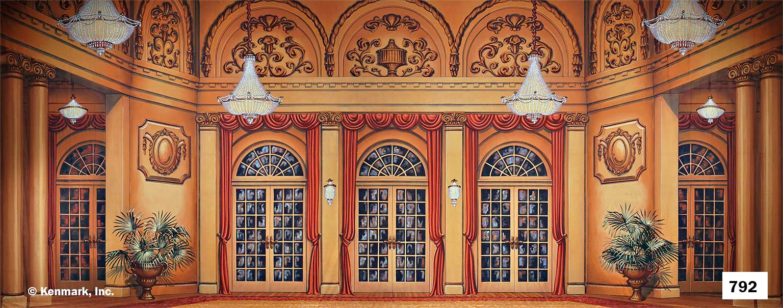 D792 Elegant Ballroom is one of the newest drops in Kenmark’s Ballroom category. It is based on one of the most popular Elegant Ballroom scenes in our inventory! This stunning drop can be used for everything from MY FAIR LADY to the NUTCRACKER BALLET. Other versions available are D922, D097, D792, D823 and D804 (in grey/blue tones with red drapes). D792 Elegant Ballroom has creamy beige walls, deep, rich red drapes and gorgeous gold scroll work. It is approximately 20 feet high by 50 feet wide and has grommets across the top with tie lines for hanging. It also has a pocket on the bottom back so if you choose you can weight the drop with a pipe.