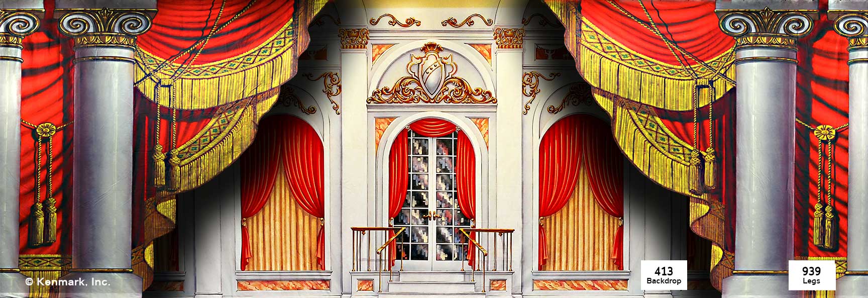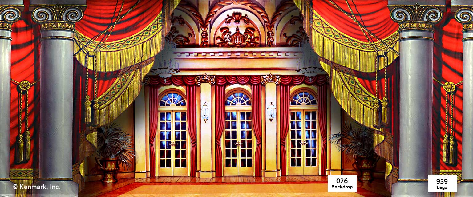 Elegant Ballroom Legs is a stunning theatrical backdrop that is frequently used for the Nutcracker. It could also be used for any production requiring an Elegant Ballroom setting such as Swan Lake. Elegant Ballroom Legs has light grey marble pillars and lush red drapes with gold fringe and tassels. It is perfect on it’s own and even more gorgeous when paired with one of our full sized ballrooms, such as D804 Elegant Ballroom Grey or D413 Stately Ballroom. Elegant Ballroom Legs is 20' high. Both legs have grommets across the top with tie lines for hanging. They also have a pocket on the bottom in the back that can be used to weight the drops with a pipe if you desire.