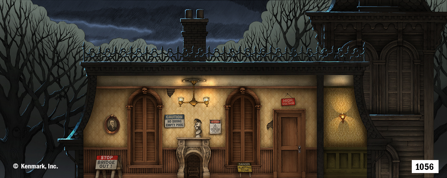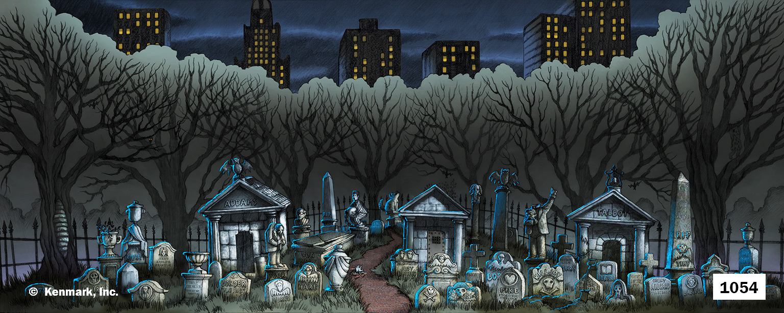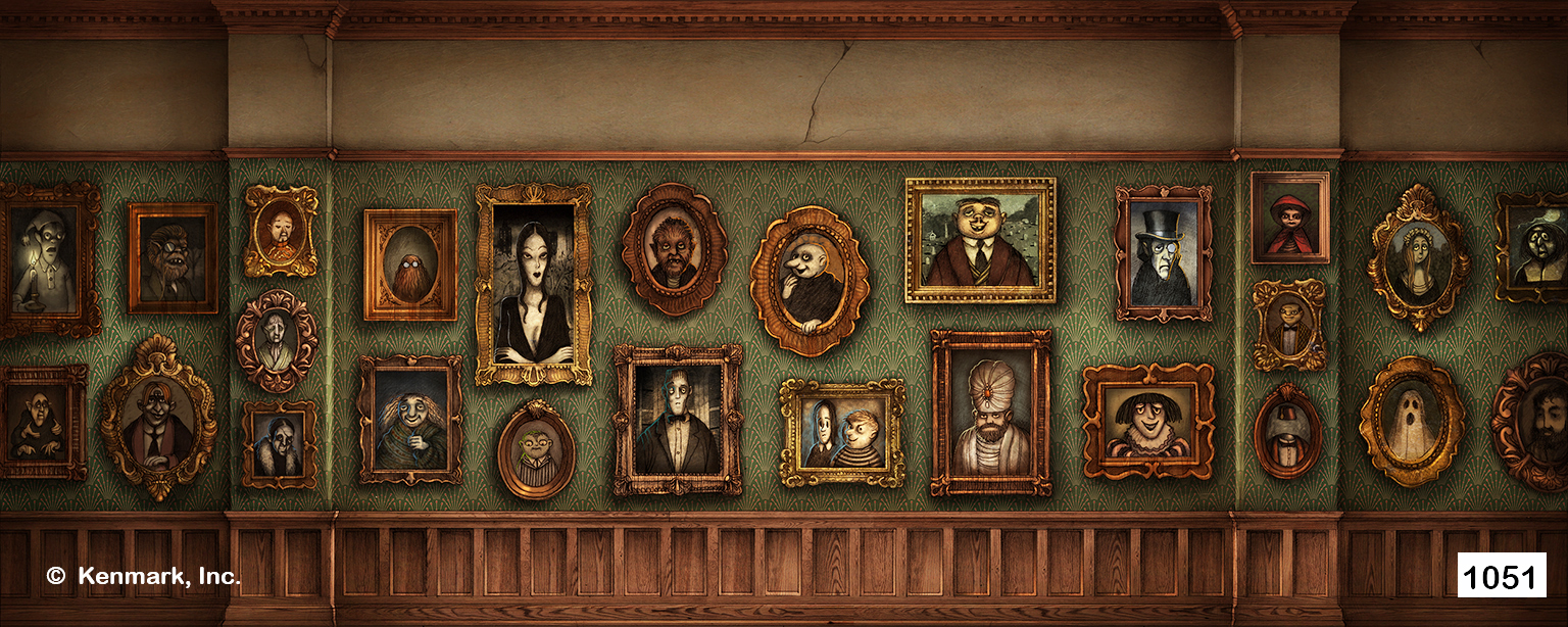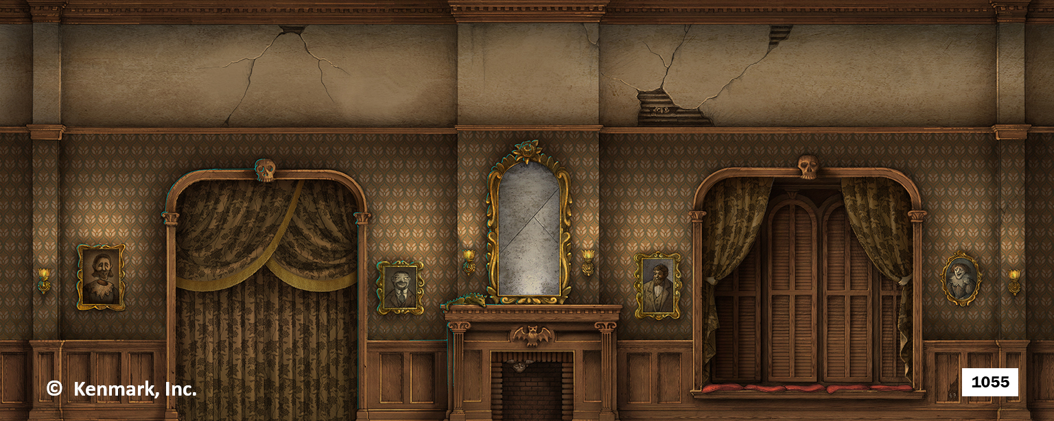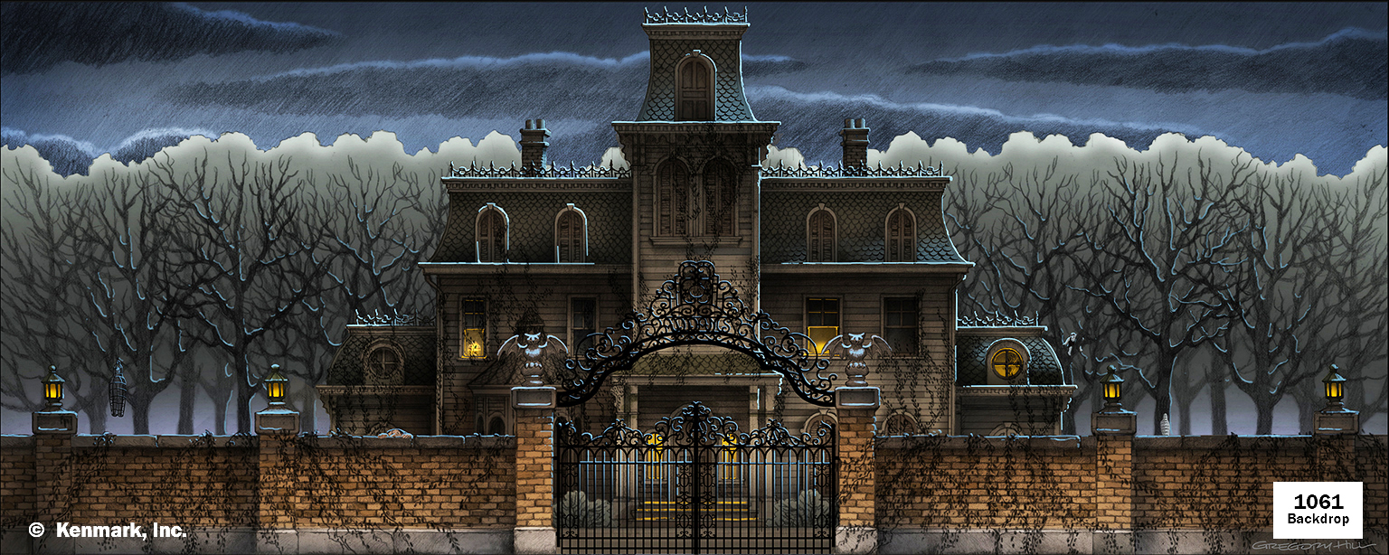 Addams Family package 1 is a complete set of complementary drops designed to present a professional and consistent look to your set. This fun and whimsical package was designed by Scenic Designer Gregory Hill and the muted color palette, Gothic design and cartoon images really capture the feel of the show. The full-size drops measure 20′ x 50′. Each drop has grommets and tie lines across the top and a pocket at the bottom so you can insert a pole to weight the drop.