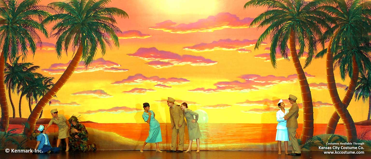Beautifully hand-painted Broadway-caliber, theatrical backdrops designed to provide continuity and quality to your “South Pacific” set.